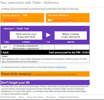 经过我详细的阅读和参考,发现搭火车是非常适合我的旅程。从巴黎的Gare de Lyon火车站出发到意大利米兰Centrale/威尼斯Santa Lucia的火车是夜间火车,就是说在火车上过一夜,睡一觉,第二天就到达目的地啦。这跨国夜间火车名叫Thello,是属于意大利经营的。Thello也有推出早鸟票,也就是优惠票,于4个月前/120天前开卖。 我买的是到米兰的票,因为计划从北一路南下到罗马。
